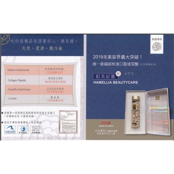 ●成分:膠原蛋白胜肽、玻尿酸(透明質酸)、山茶花籽萃取物、離氨酸