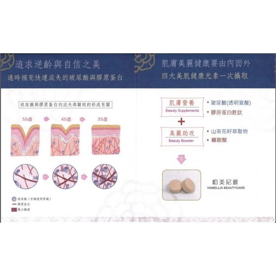 ●成分:膠原蛋白胜肽、玻尿酸(透明質酸)、山茶花籽萃取物、離氨酸